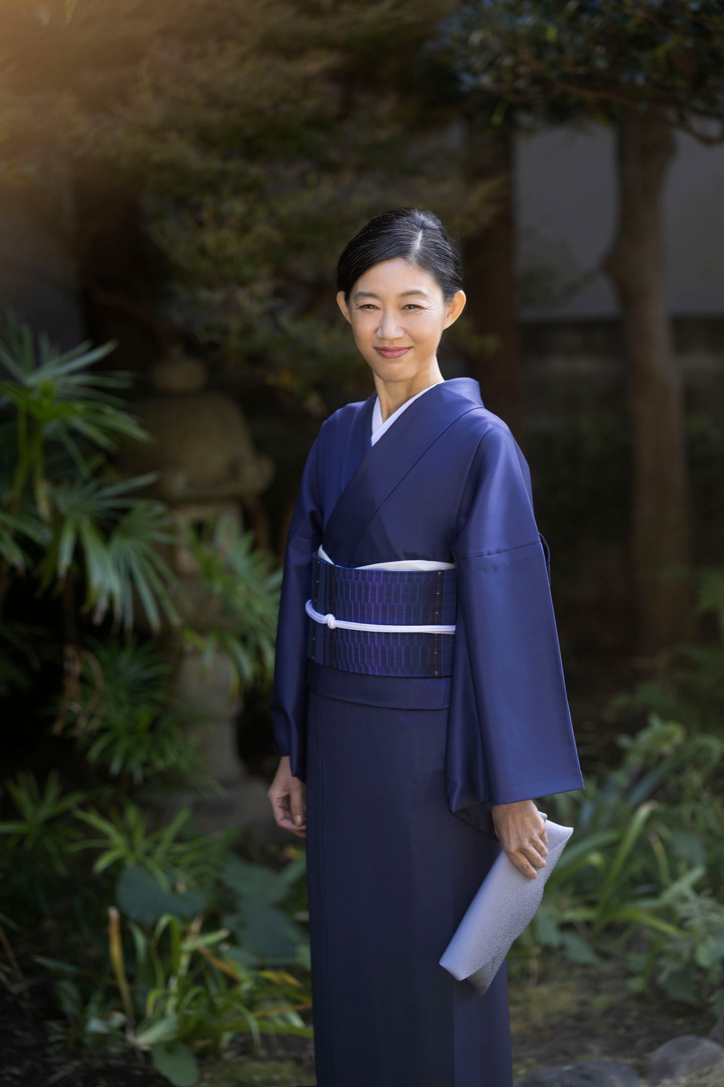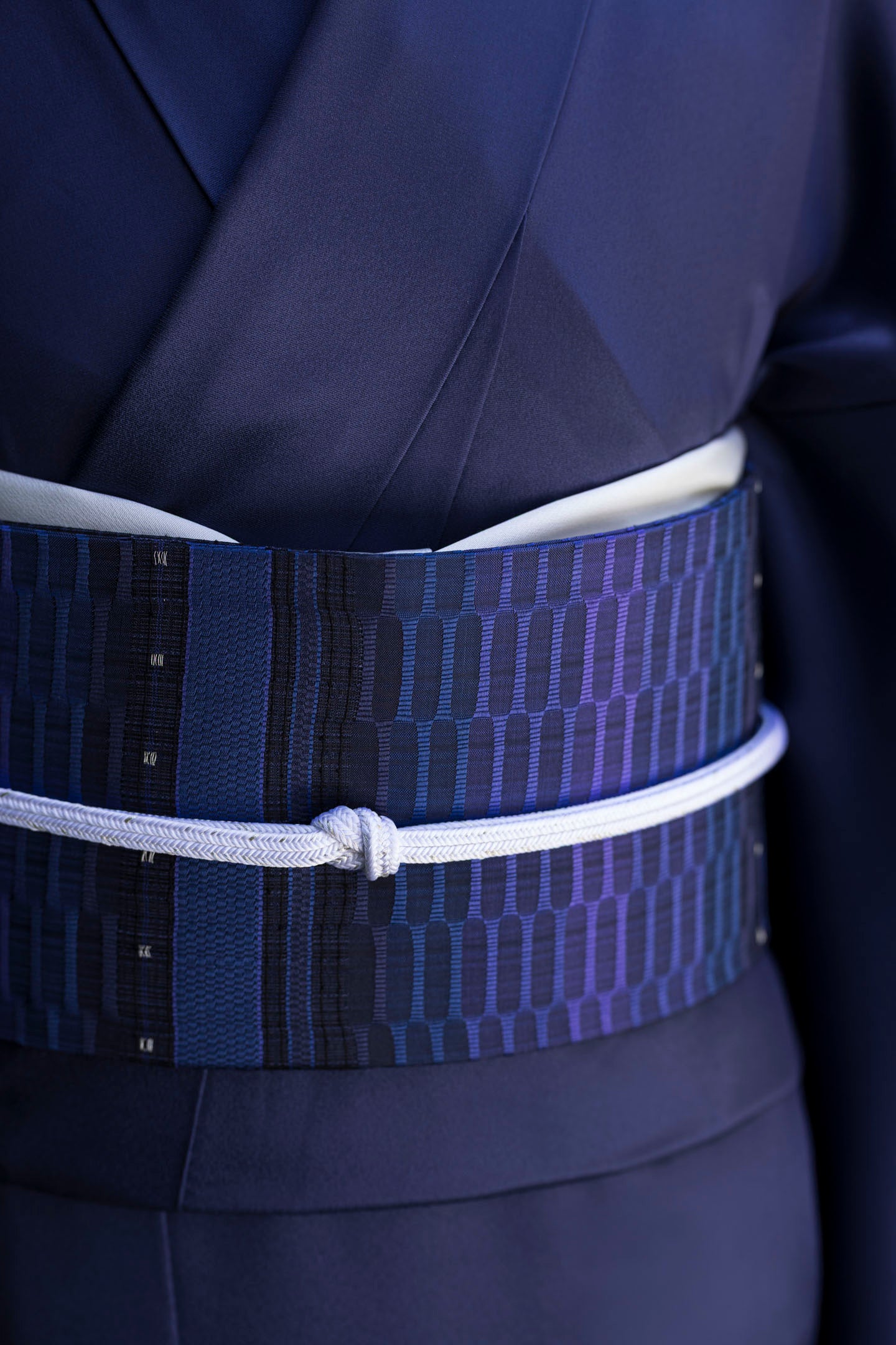帯合わせには、シンプルシックで美しさを引き立たせてくれる紺地濃淡の紅間道を。