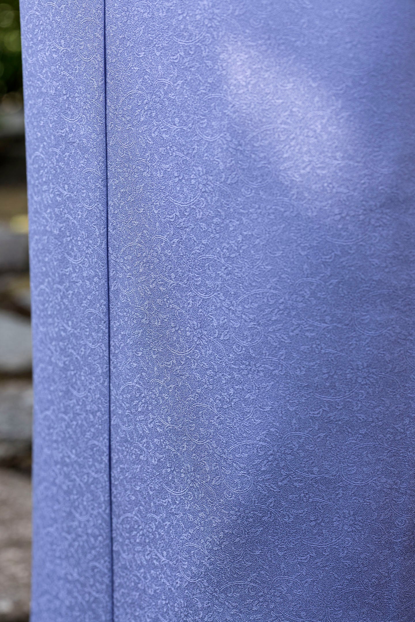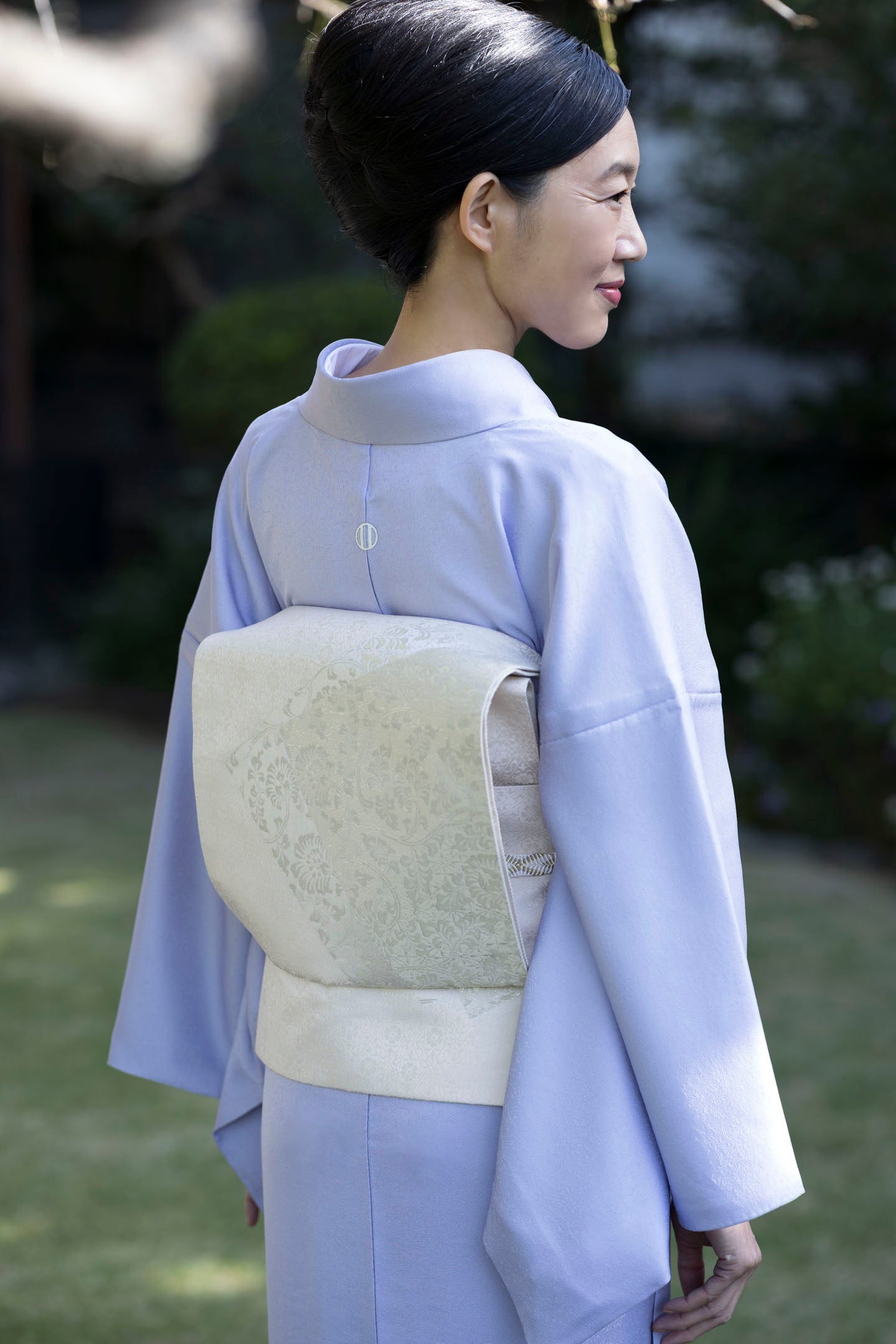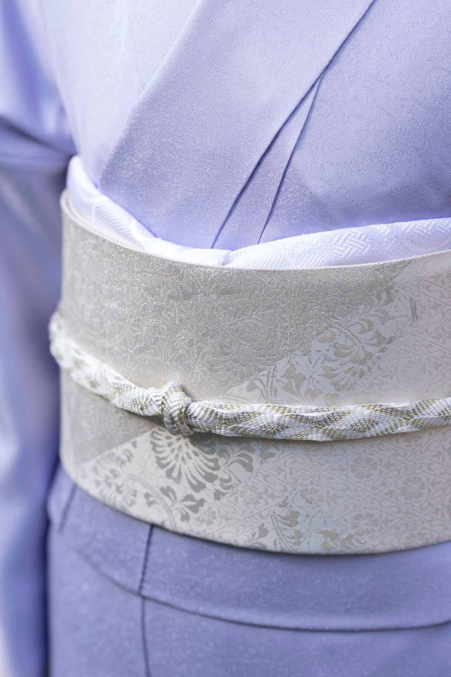 冬の低い日差しを浴びると、地紋の唐草紋様の曲線が優しさを、控えめな表現で上品さを与えてくれます。藤紫は、寒色でありながらもどこか温かみを感じさせる不思議な色。冬の凍てつく景色の中に、一輪の花が咲いたような、見る人の心まで解きほぐす気品を演出します。