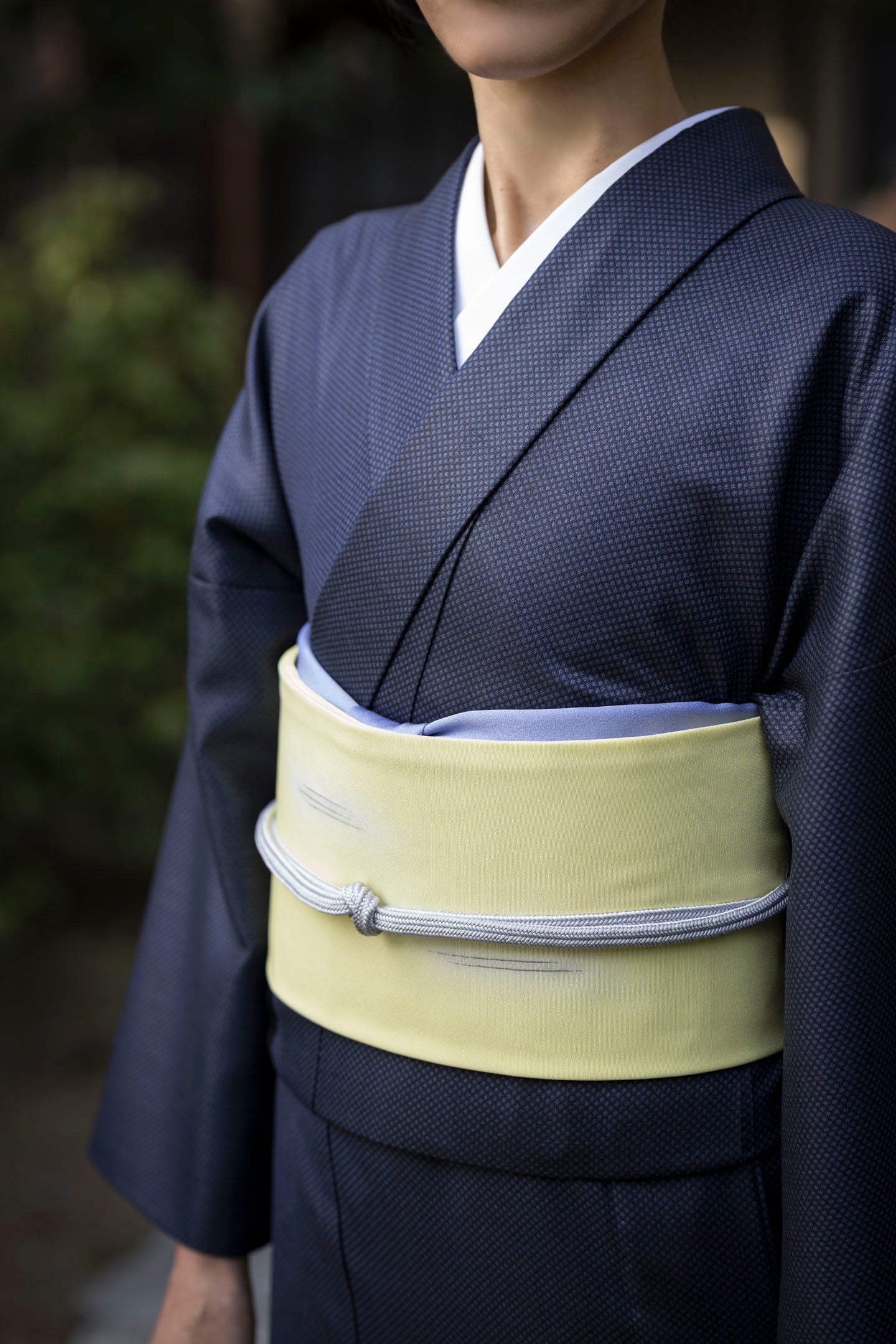 コーディネートの主役は、春の訪れを象徴するような「檸檬色/薄藤色」の帯。 霞(かすみ)がたなびく様子を表現したこの帯は、まさに立春の時期にふさわしい一枚です。