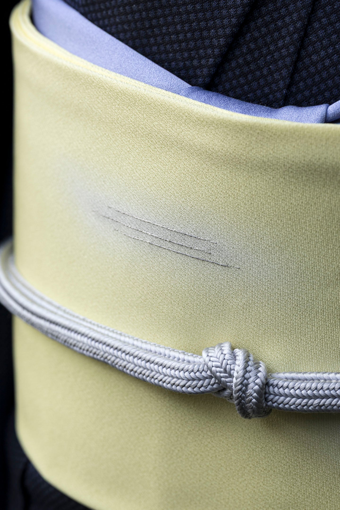 落ち着いたネイビーの着物に、この明るく柔らかな春色が加わることで、装い全体がパッと華やぎ、春の光を味方につけたような清々しさが生まれます。職人の技が光る「刺繍の立体感」も、シンプルな中に奥行きを感じさせます。