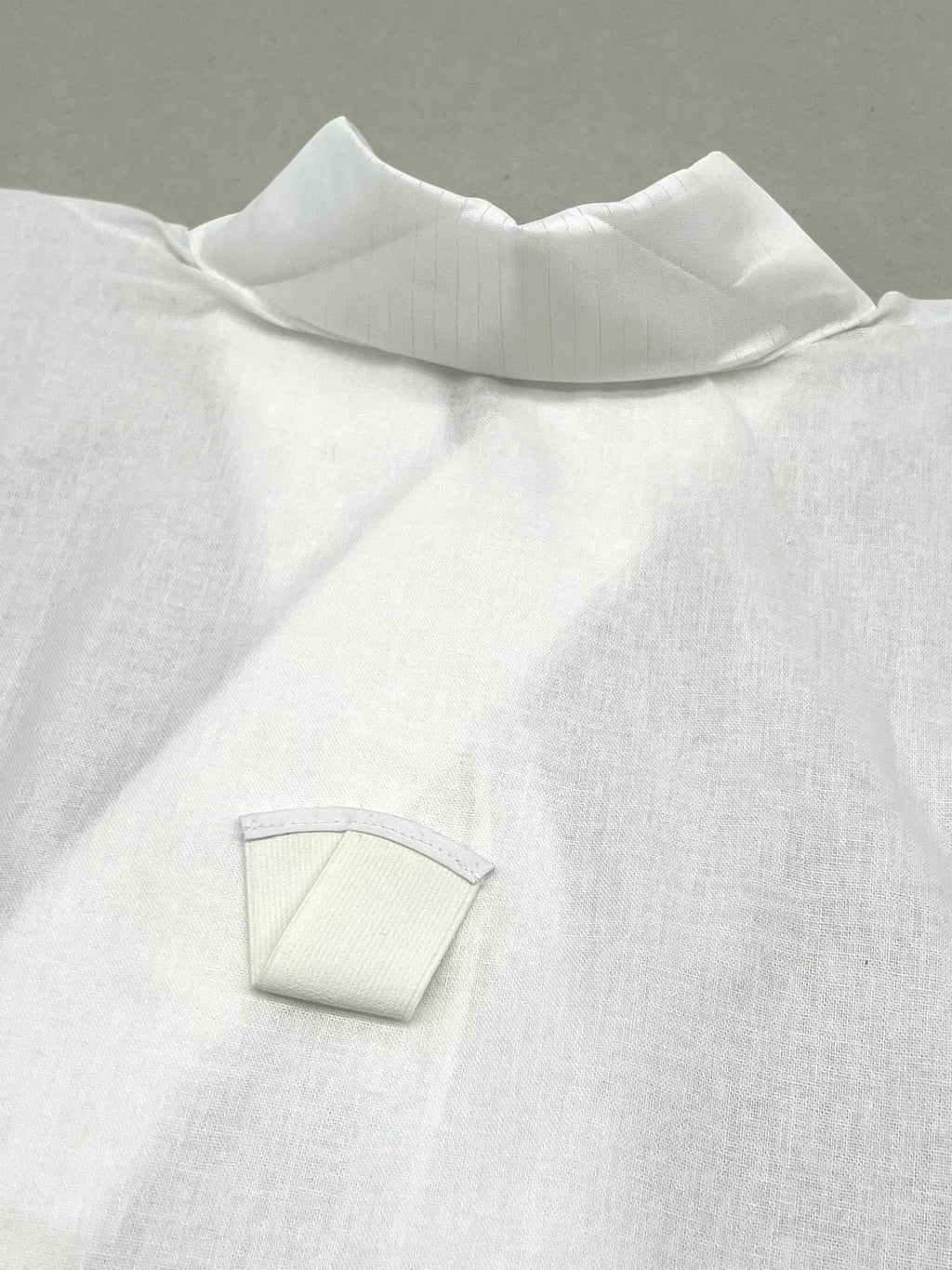 いきなり縫うより、安全ピンなどで留めてみて、一度(ピンが付いているので気をつけて)羽織っていただき、長さの具合をご確認いただいてから、縫っていただくことをオススメします。