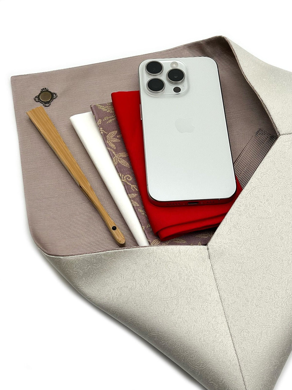茶道用の数寄屋袋としてだけではなく、着物をお召しになられない方がパーティーバッグとして、大きい荷物は預けて、これだけ手元に置いておくような使い方、そして、海外の方が、お選びくださることも多い商品です。