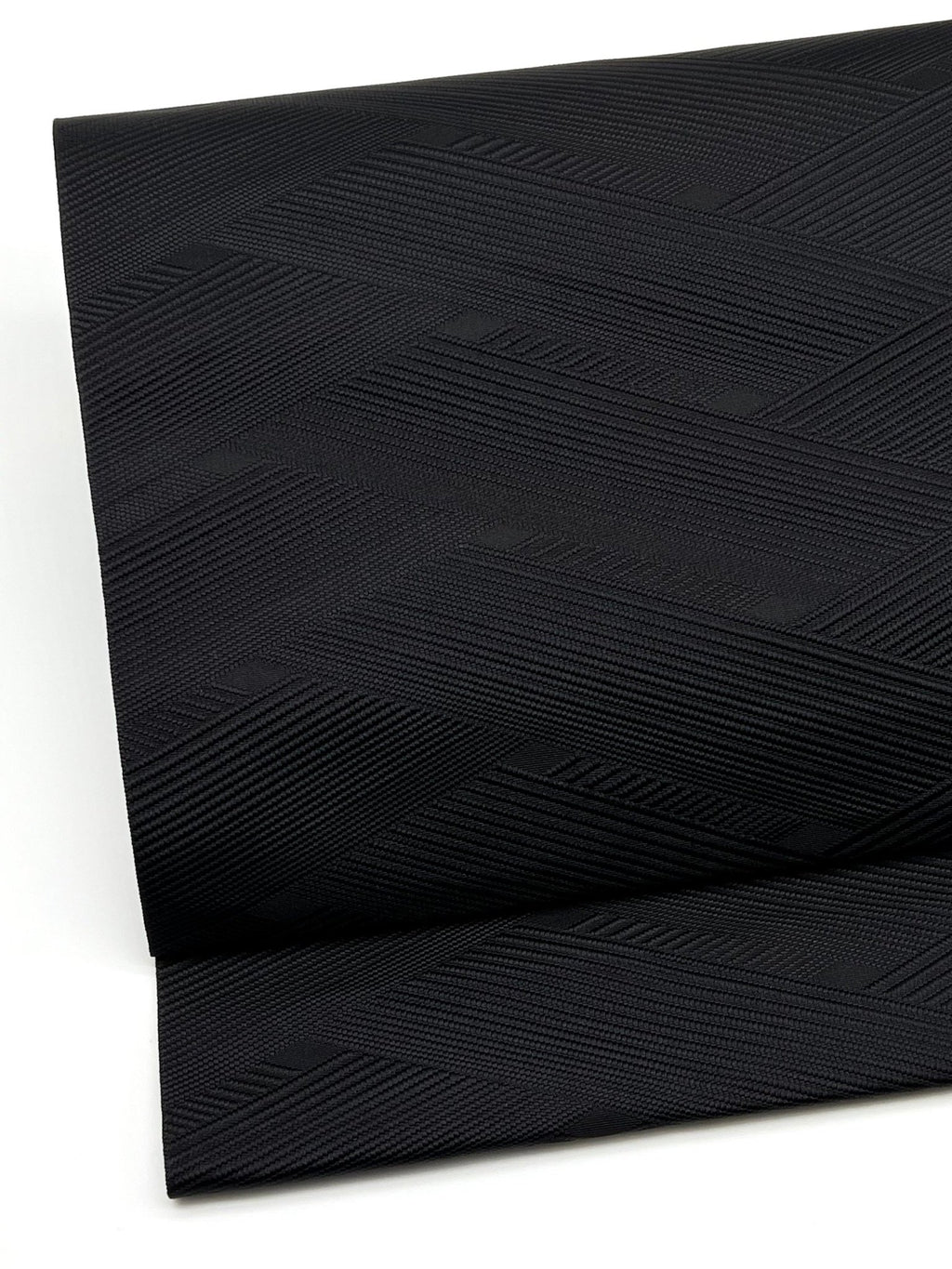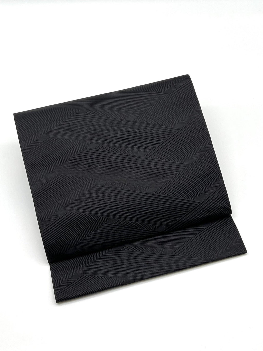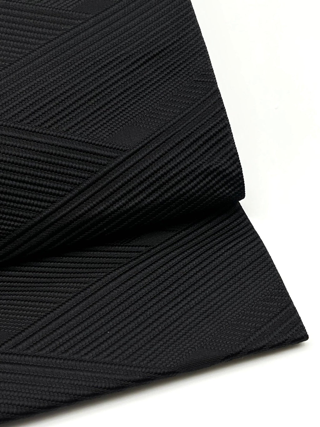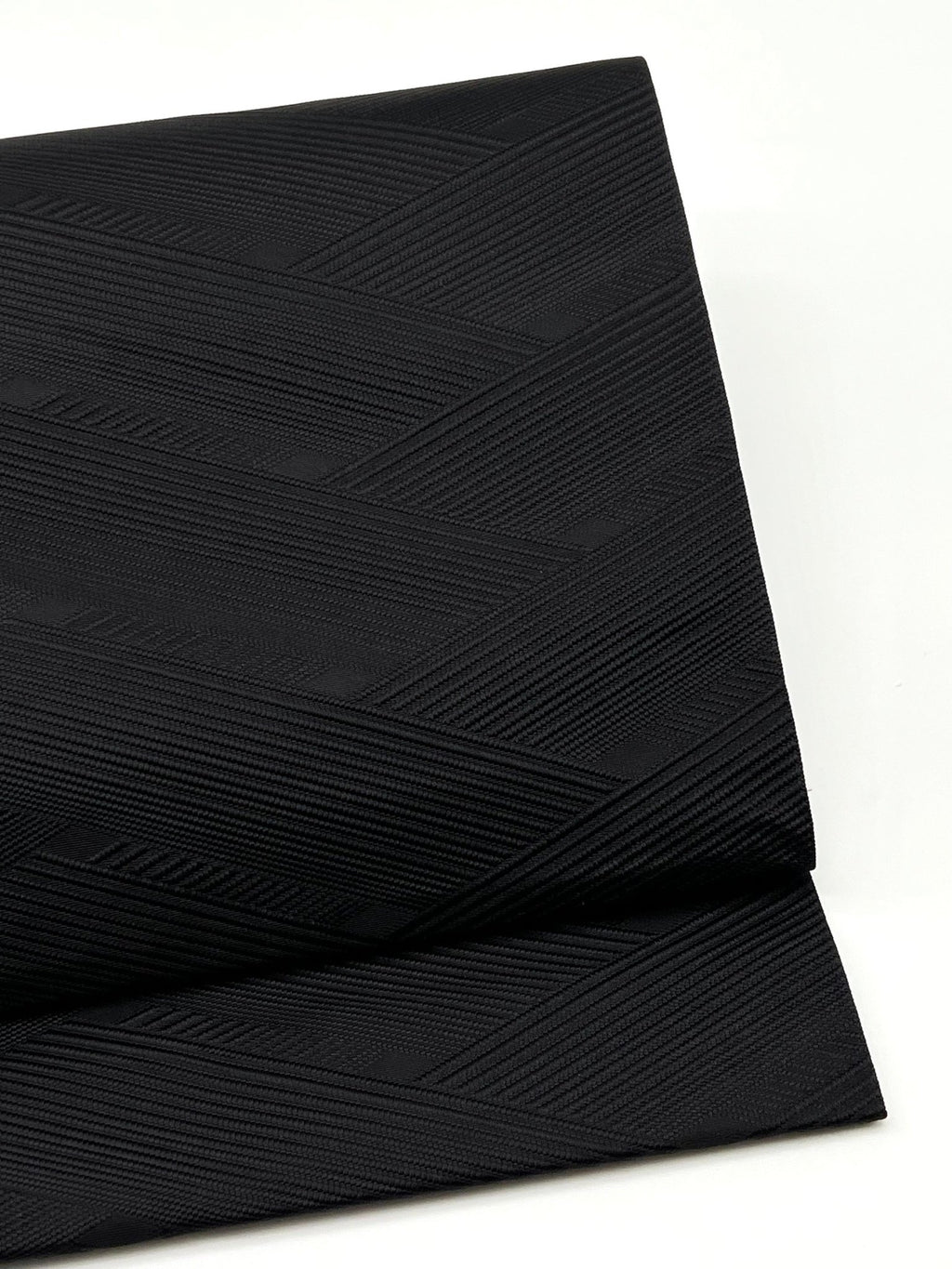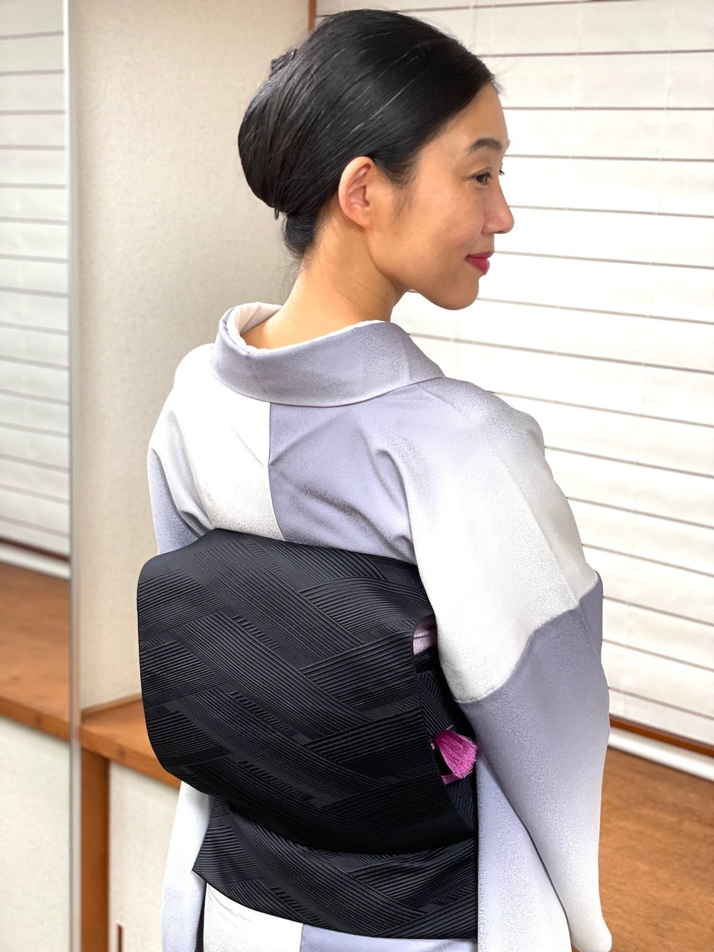 写真ではなかなか伝わりづらいのですが、こちらには光沢感のある上質な黒い絹糸に黒漆の糸を使用しています。華美な礼装の帯とは異なり、この黒漆の糸が奥ゆかしい艶や上質さを表現しています。また、体に巻きつけると博多織特有の経糸(たていと)が独特の網代の立体感を作り出し、平面に置いていたときとは異なる表情を見せ始めます。お太鼓の向きでは少し艶が強調され、お腹に巻く向きだと艶は抑え目に感じられます。