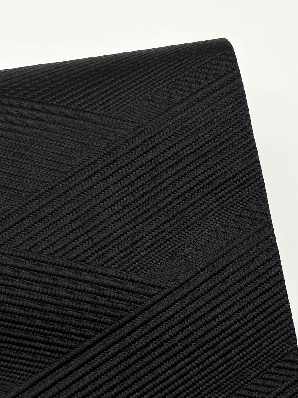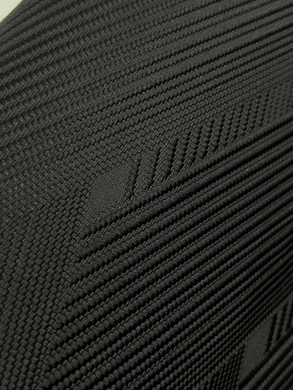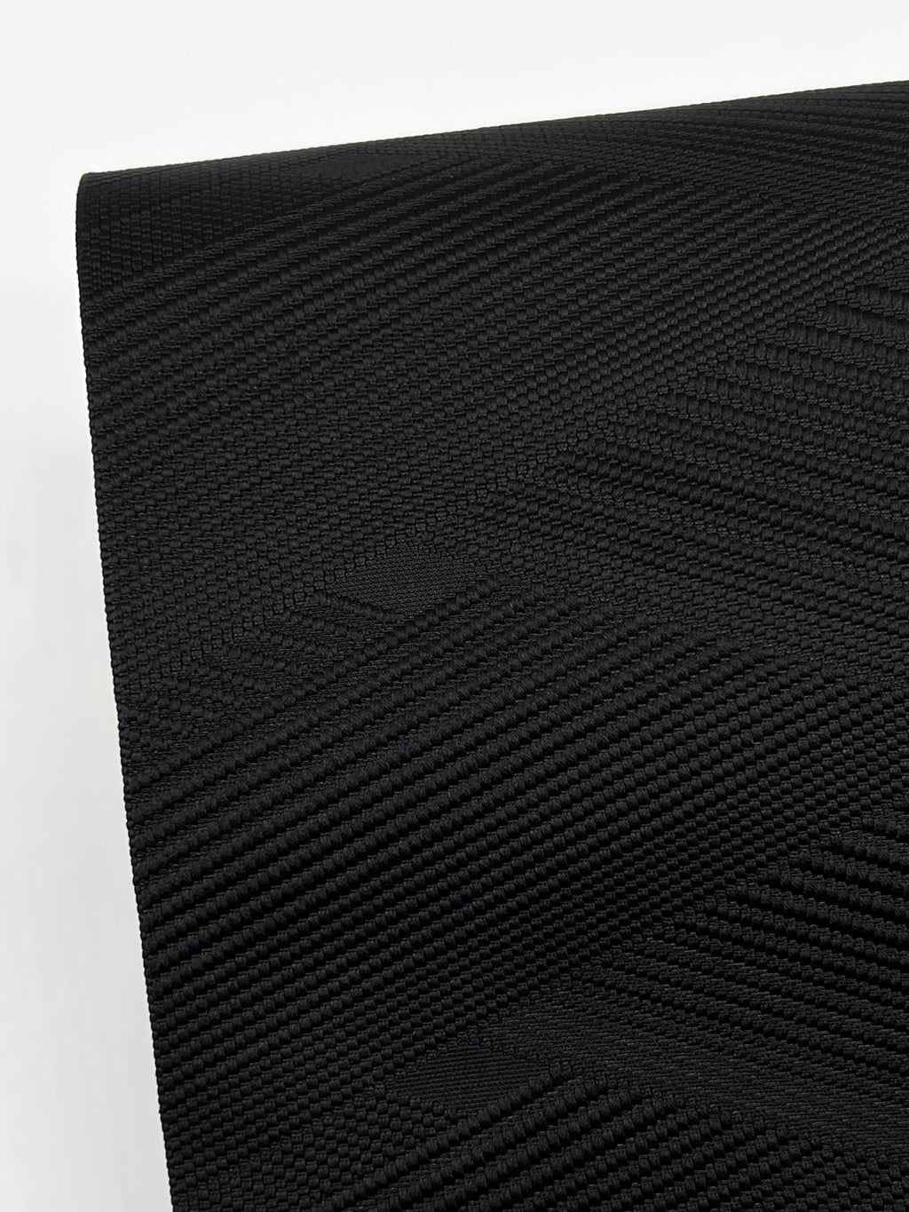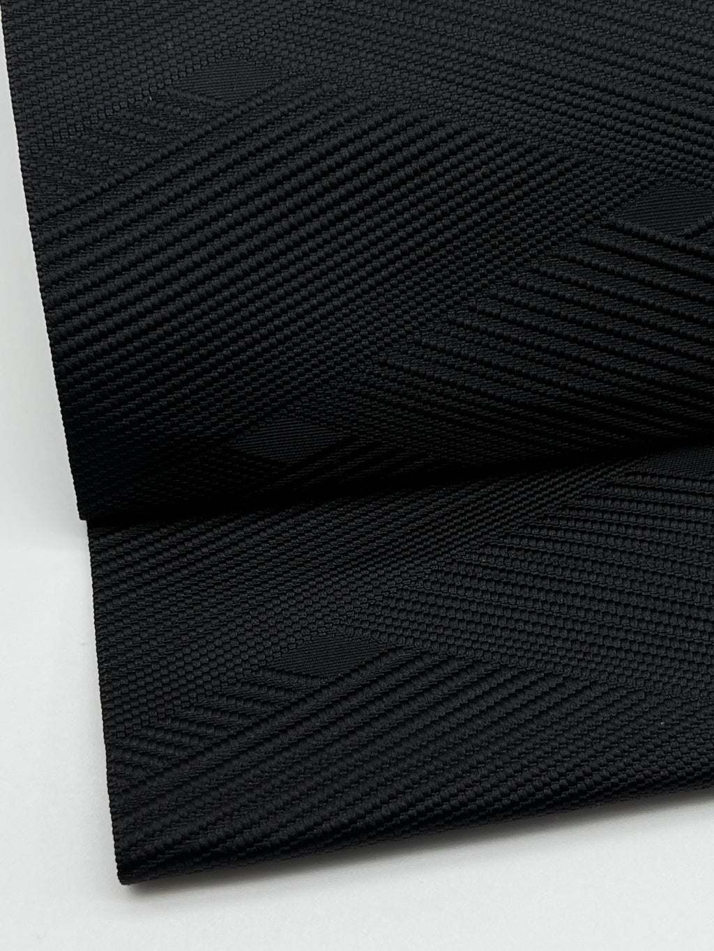 写真ではなかなか伝わりづらいのですが、こちらには光沢感のある上質な黒い絹糸に黒漆の糸を使用しています。華美な礼装の帯とは異なり、この黒漆の糸が奥ゆかしい艶や上質さを表現しています。また、体に巻きつけると博多織特有の経糸(たていと)が独特の網代の立体感を作り出し、平面に置いていたときとは異なる表情を見せ始めます。お太鼓の向きでは少し艶が強調され、お腹に巻く向きだと艶は抑え目に感じられます。