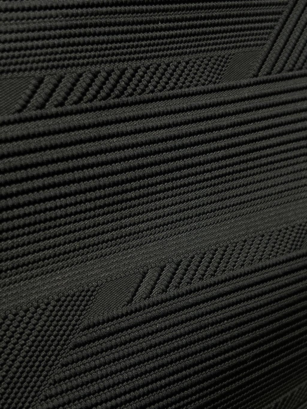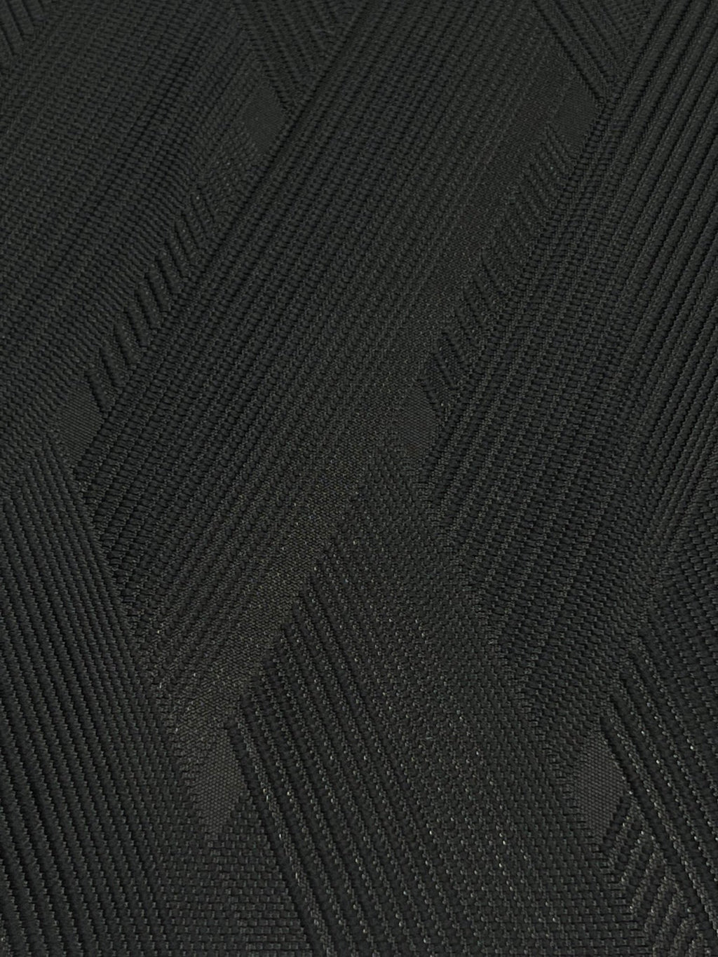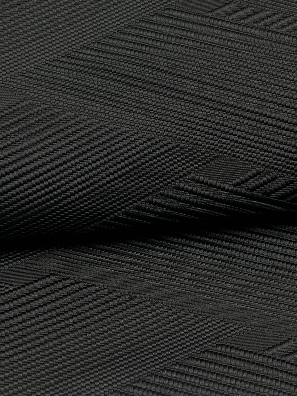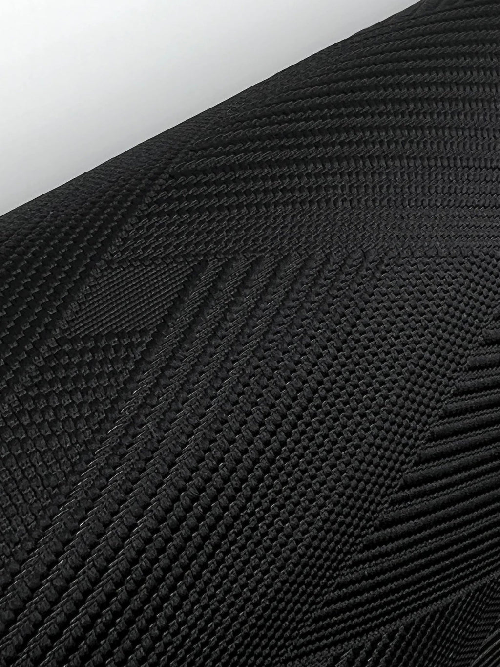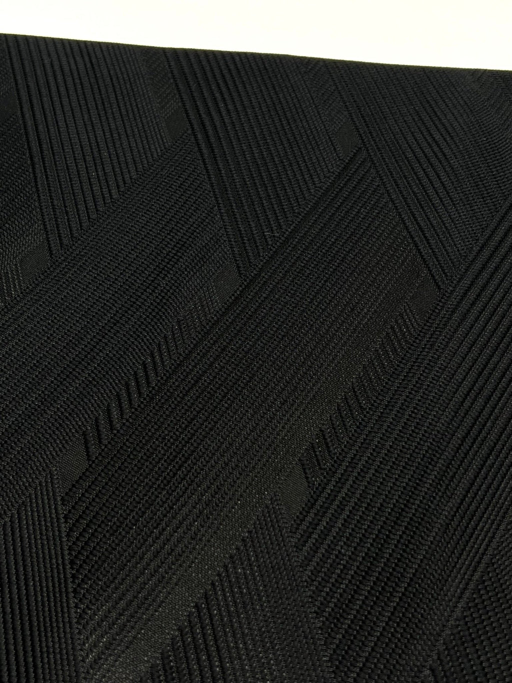 写真ではなかなか伝わりづらいのですが、こちらには光沢感のある上質な黒い絹糸に黒漆の糸を使用しています。華美な礼装の帯とは異なり、この黒漆の糸が奥ゆかしい艶や上質さを表現しています。また、体に巻きつけると博多織特有の経糸(たていと)が独特の網代の立体感を作り出し、平面に置いていたときとは異なる表情を見せ始めます。お太鼓の向きでは少し艶が強調され、お腹に巻く向きだと艶は抑え目に感じられます。