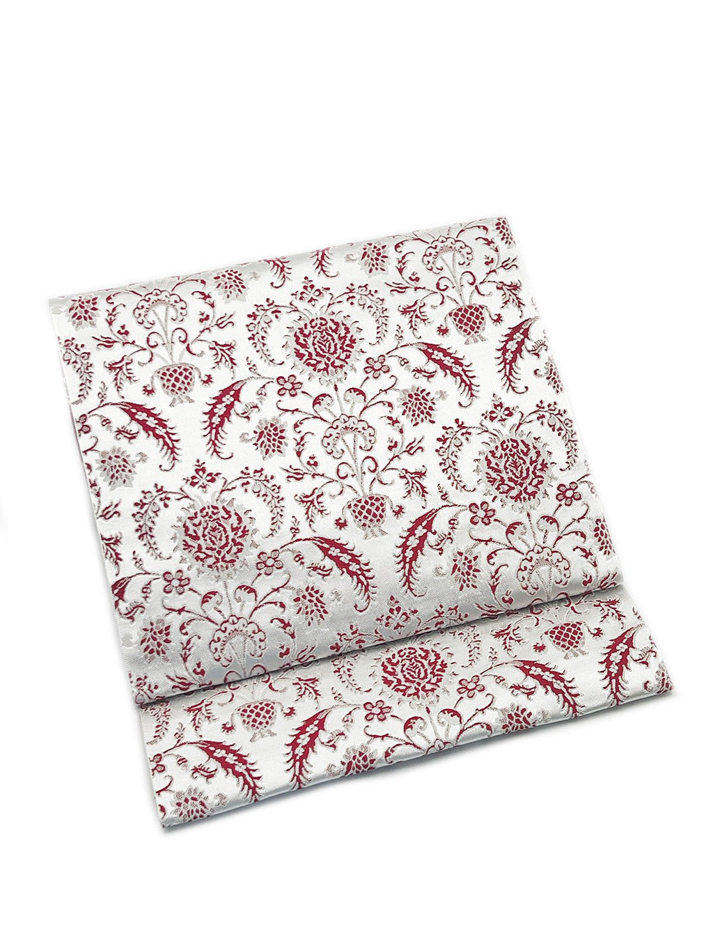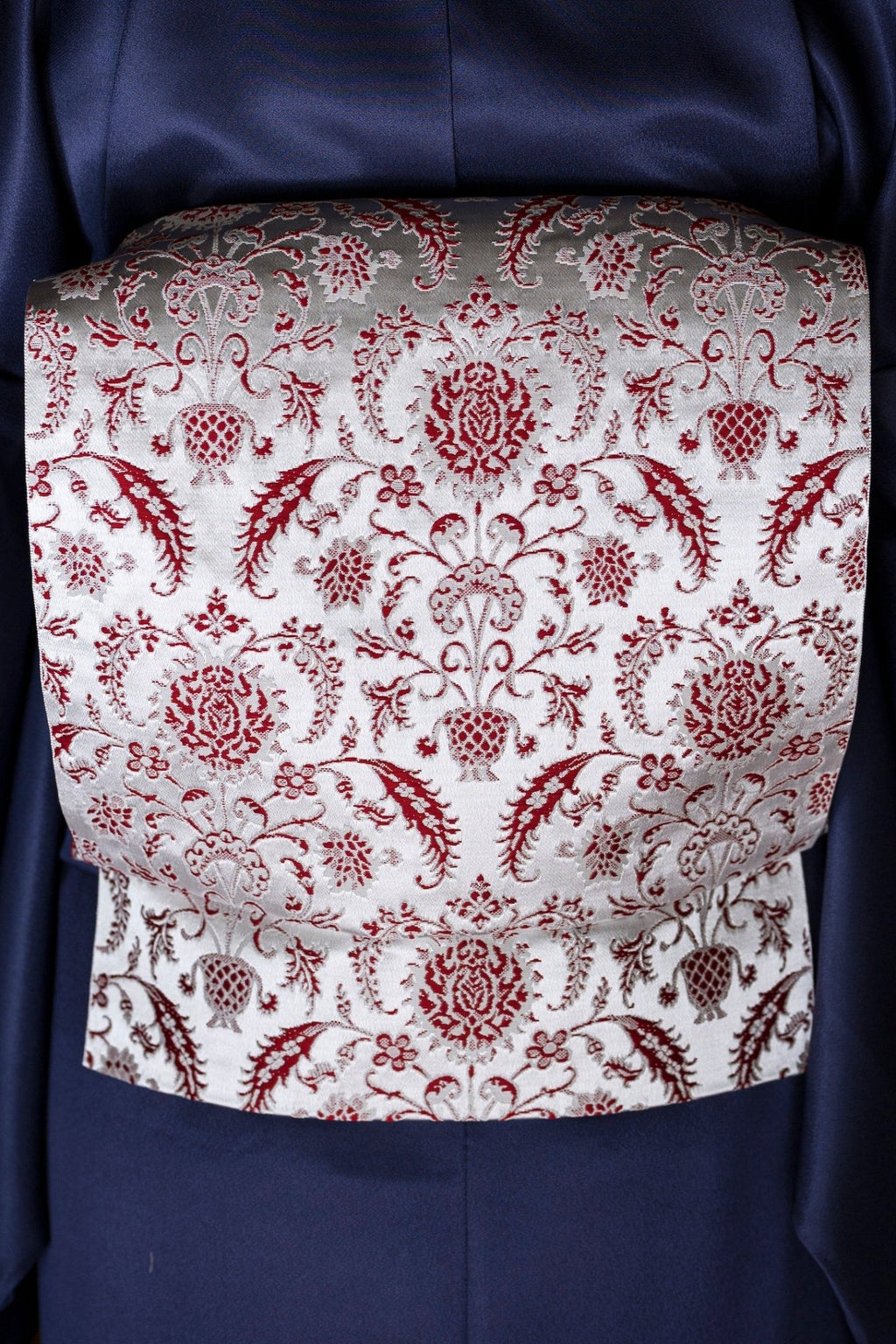 【新色/期限特典】 博多織八寸名古屋帯 ペルシャ草花紋 薄鼠地に深紅 [紅衣オリジナル] - 木下着物研究所
