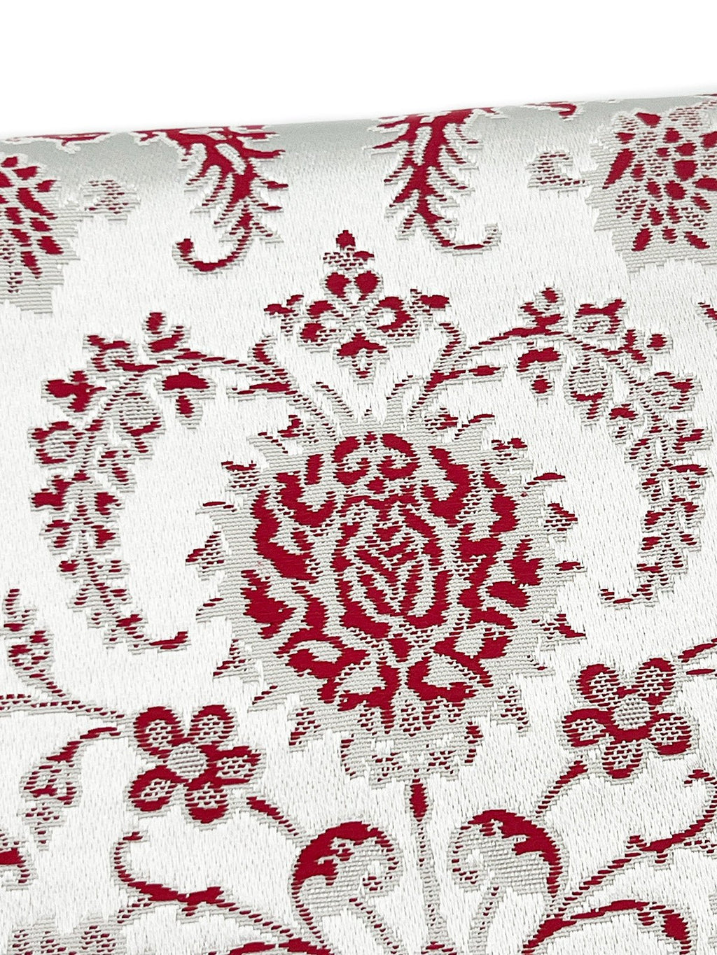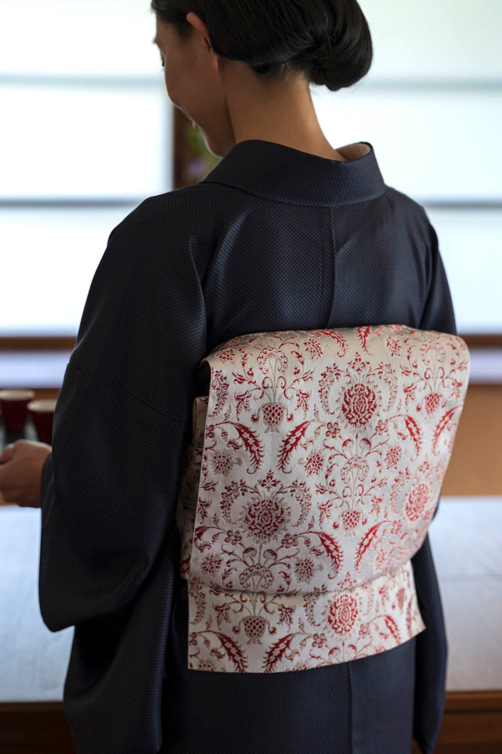 【SHOWROOM/先行ご紹介商品】【新色】 博多織八寸名古屋帯 ペルシャ草花紋 薄鼠地に深紅 [紅衣オリジナル] - 木下着物研究所
