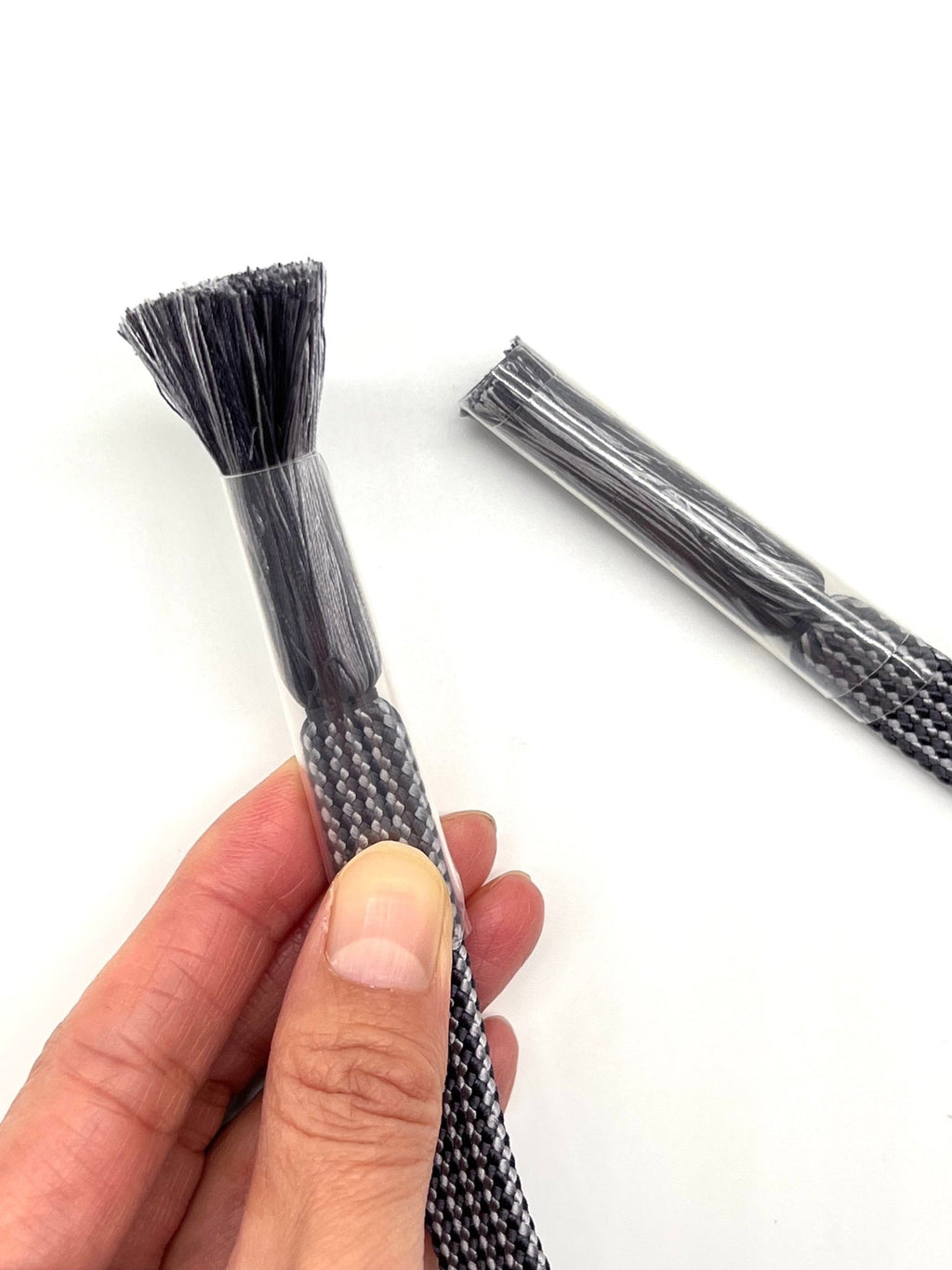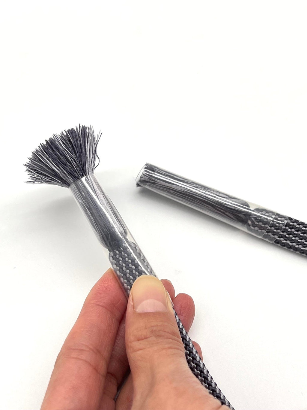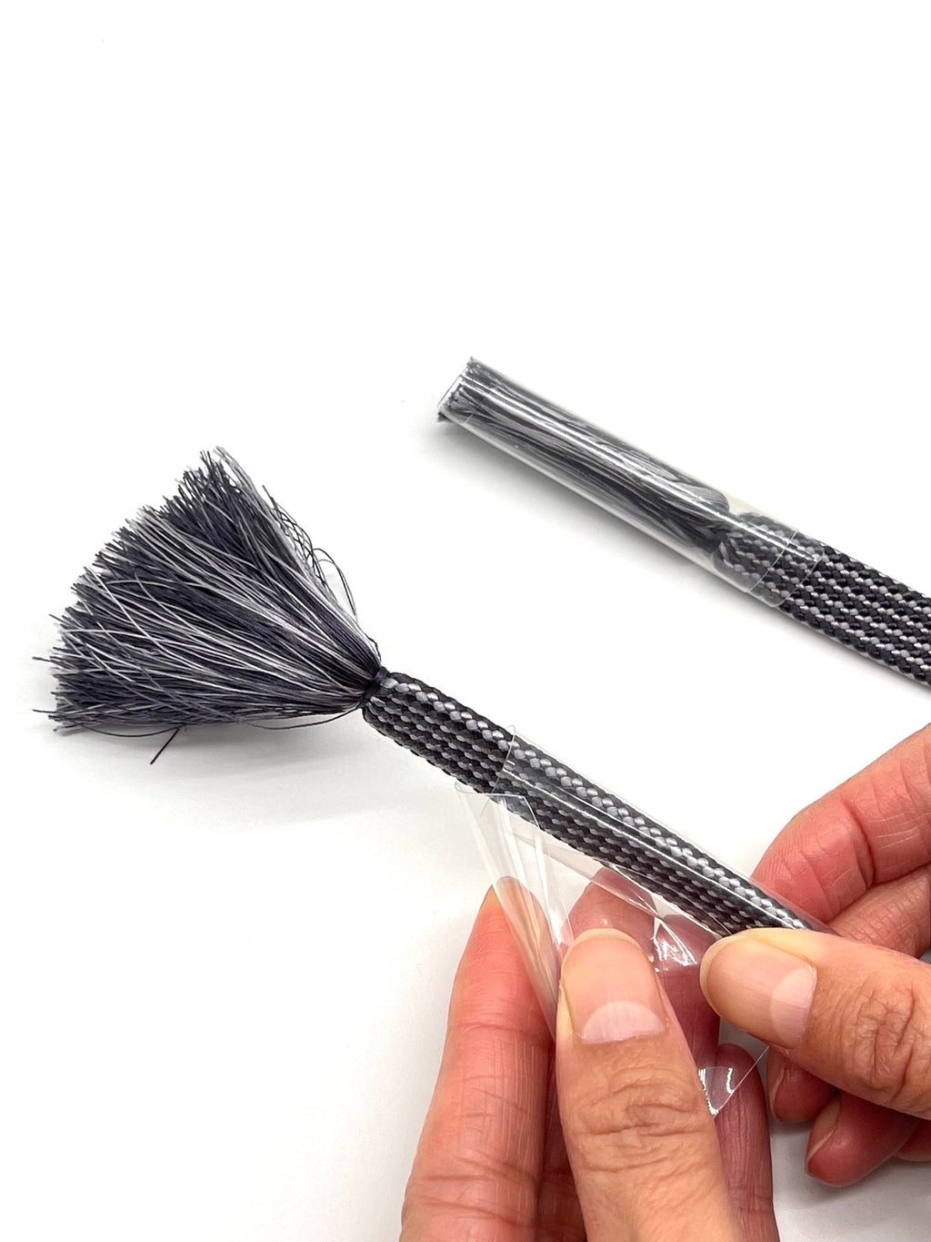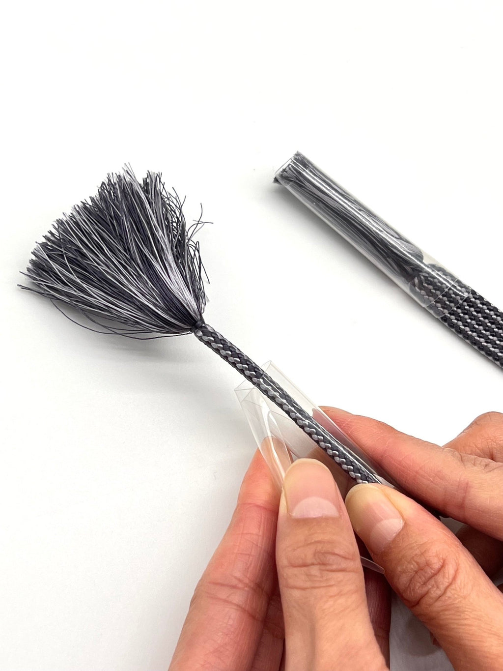フサフサした糸の部分にパーマのようなうねりが生じないように、綺麗な状態でキープできるよう、本体部分に丸まっているカバーを広げて装着させてから、房の部分に滑らせて使用します。
